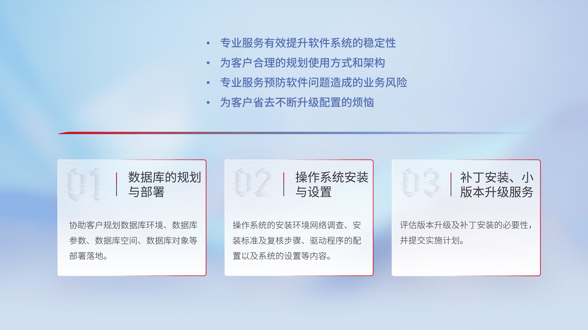以“客户业务为中心+业务系统安全可靠运行为目标”的服务理念,对客户的数据中心机房软硬件设备日常维护,检查相关的软硬件系统设计的维保策略合理性。确保客户的业务系统稳定安全、可用性高,提升灵活、可扩展性和资源利用率。